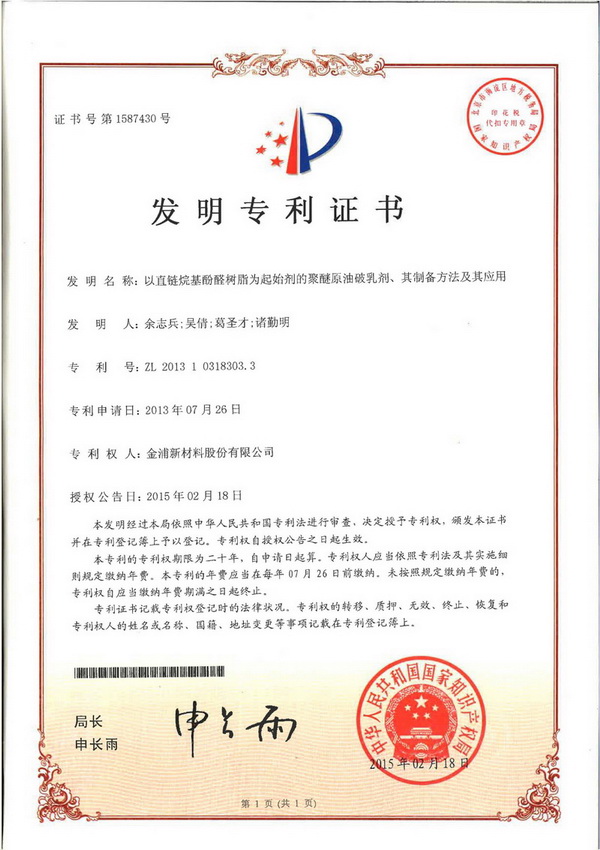金浦新材自主研發(fā)的聚醚原油破乳劑于20137月申請(qǐng)發(fā)明專(zhuān)利“以直鏈烷基酚醛樹(shù)脂為起始劑的聚醚原油破乳劑、其制備方法及其應(yīng)用”,并于2015218日取得了授權(quán)證書(shū)。